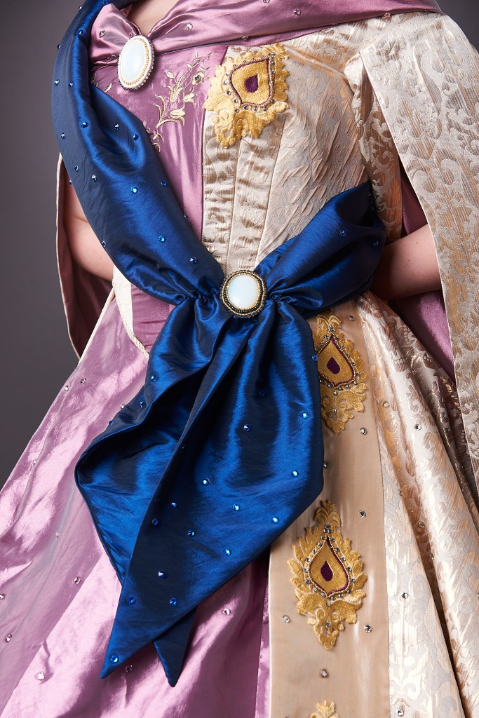 My version is heavily inspired by Victorian and Edwardian fashion. I wanted the Victorian shape with an elliptical crinoline but chose Edwardian style corset and chemise. Other than being historically inspired I’m a big fan of everything embroidery and crystals. I designed, digitized and embroiderd over 10 appliques for the skirt and bodice including the embroidery on the front of the bodice. The appliques were sewn on by hand and then decorated with tiny rhinestones for extra sparkle.